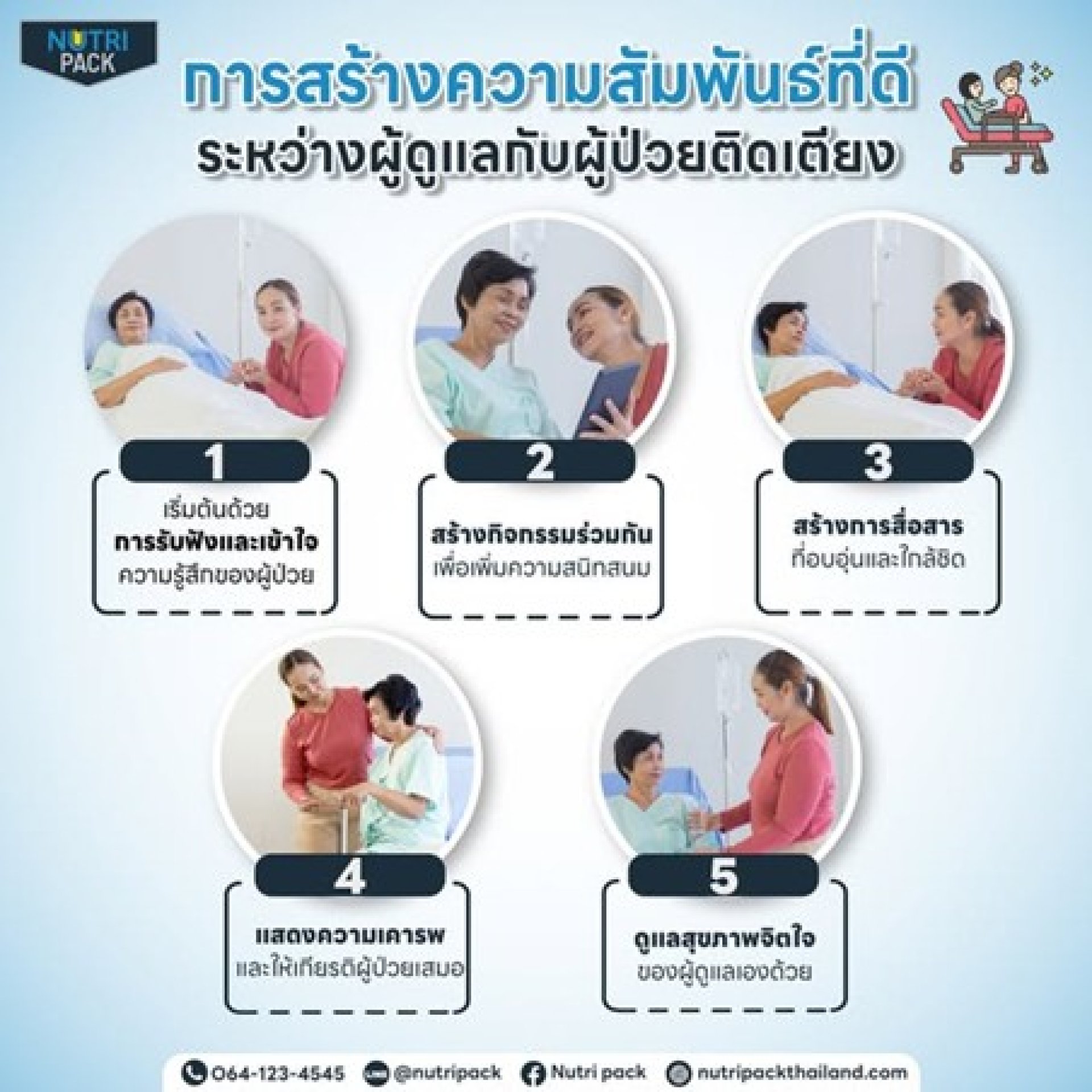 การสร้างความสัมพันธ์ที่ดีระหว่างผู้ดูแลกับผู้ป่วยติดเตียงจะช่วยให้ทั้งสองฝ่ายรู้สึกถึงความผูกพันและการสนับสนุนซึ่งกันและกัน ซึ่งจะช่วยให้ผู้ป่วยมีสุขภาพจิตที่ดีขึ้นและผู้ดูแลเองก็มีความสุขและความพึงพอใจในการดูแลอย่างต่อเนื่องค่ะ